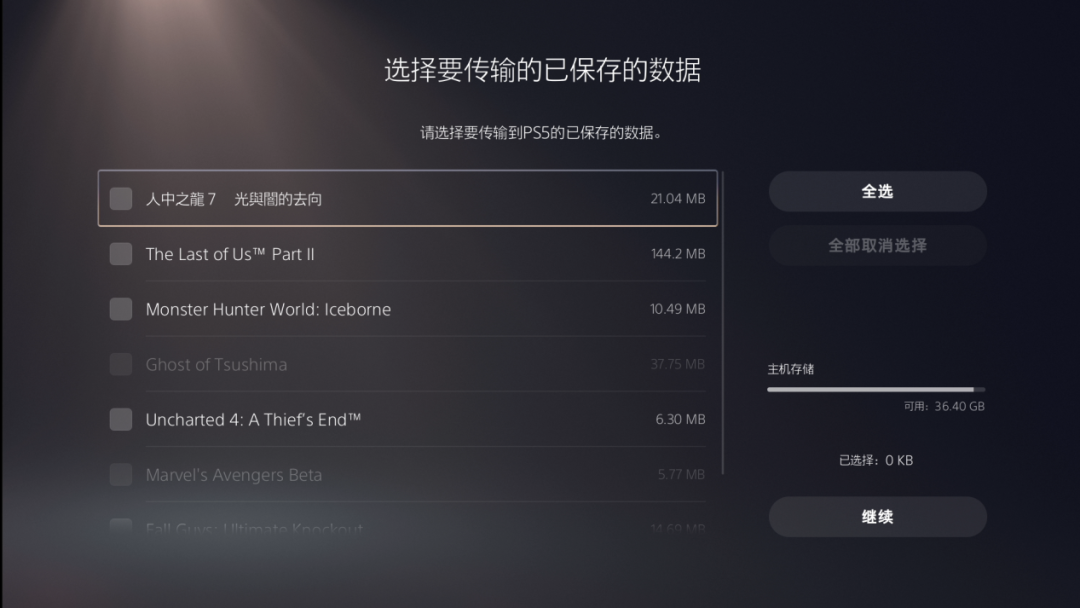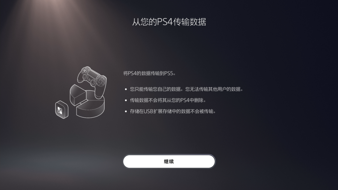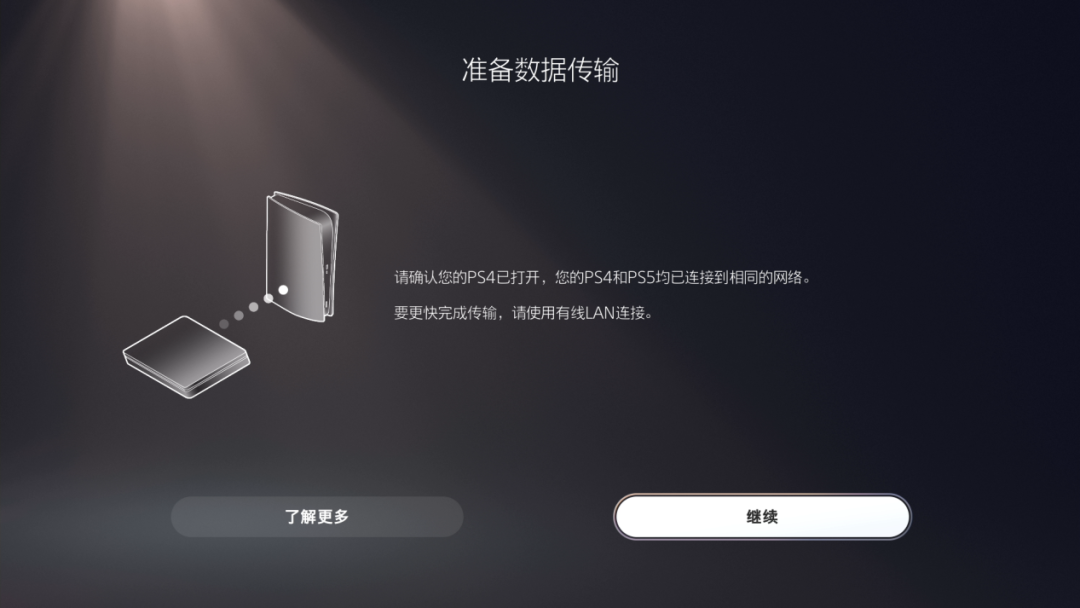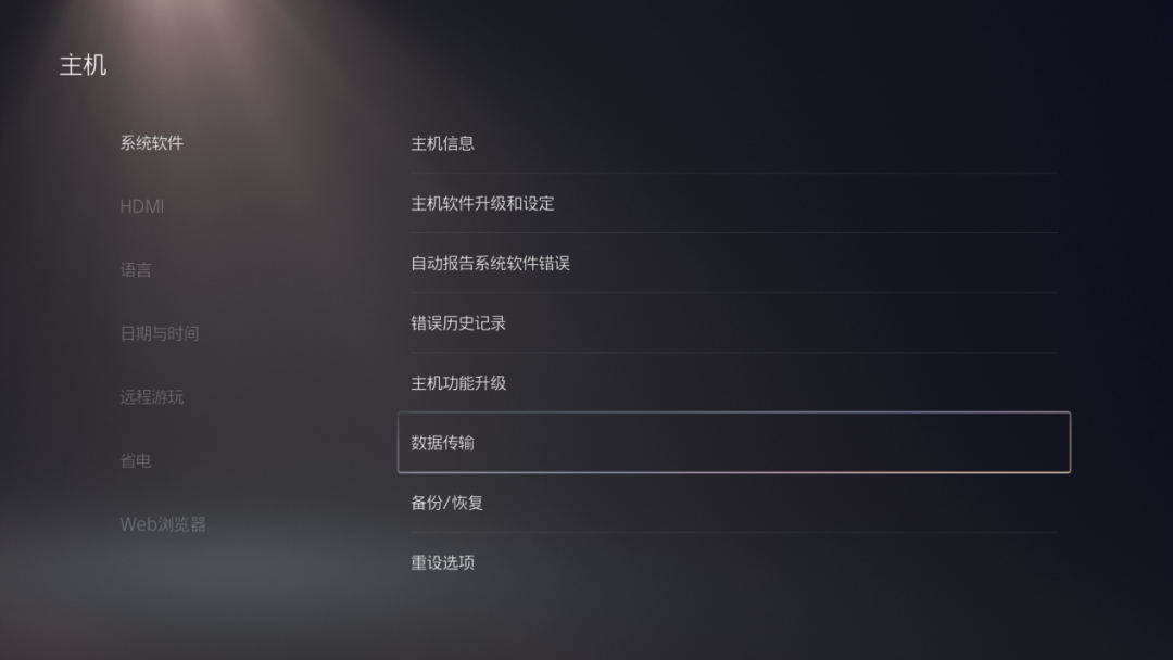 隨後在PS5上選擇【設置→主機→系統軟體→數據傳輸】進入數據傳輸畫面。