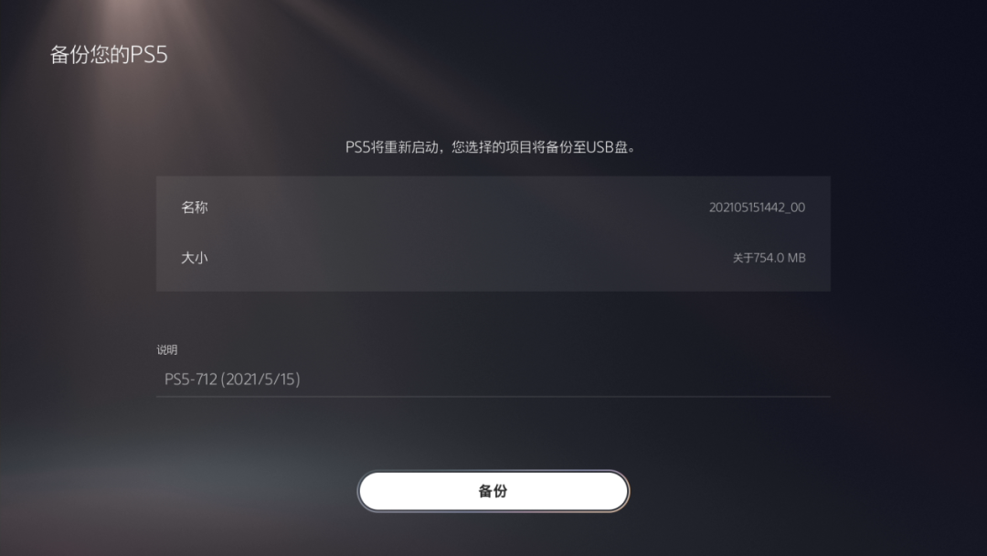 2.將U盤插在非國行PS5上後按下列步驟【設定→主機→系統軟體→備份/恢復→備份您的PS5→自行選擇要備份的內容→等待PS5重啟並拷貝備份文件→拔除U盤完成備份】隨後等待PS5完成重啟。