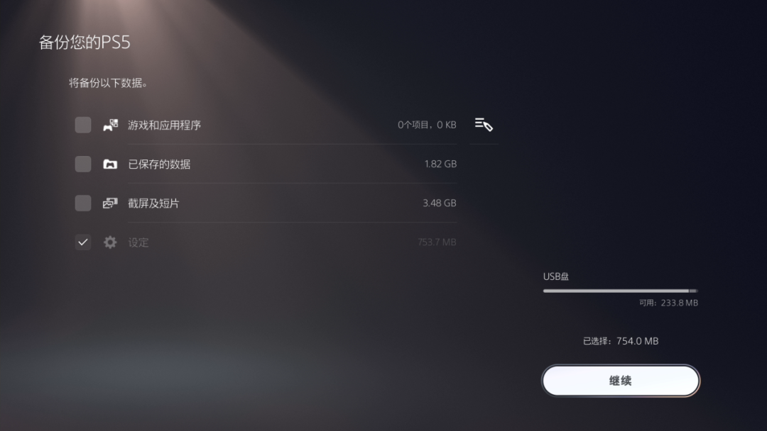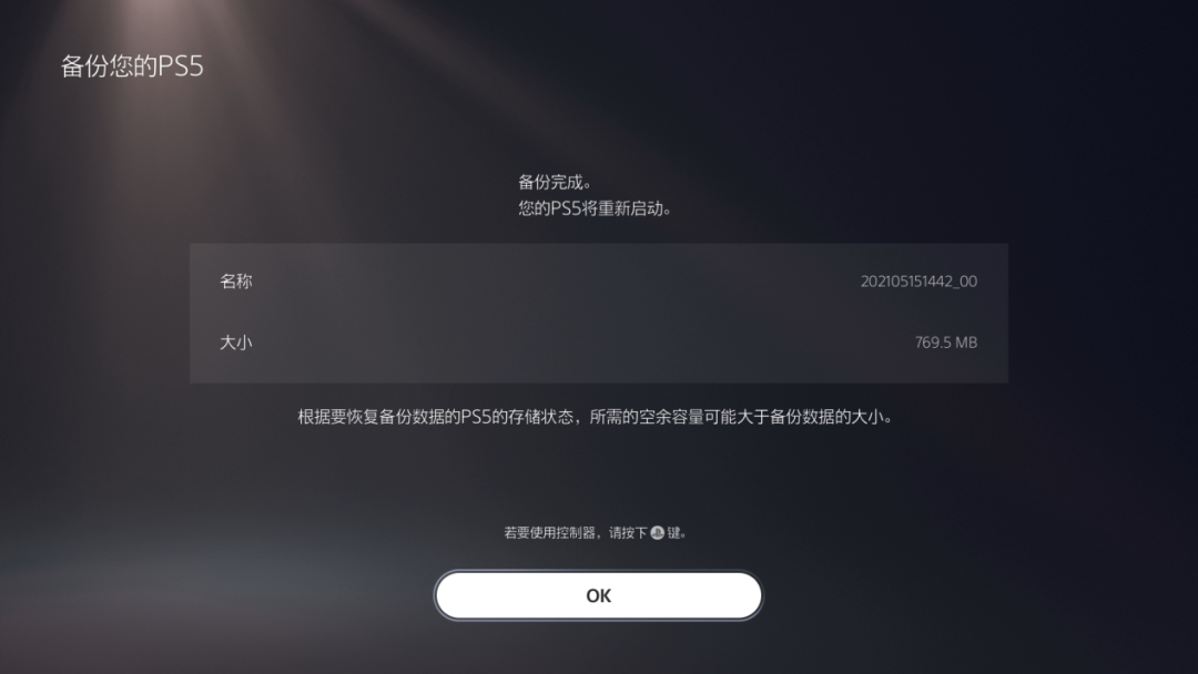 進行備份時如果發生U盤具有足夠空間但仍提示【USB儲存裝置的可用容量不足】說明PS5不支持該U盤進行備份,請更換所用U盤,僅備份賬號數據文件大小約為750MB左右,供大家參考。