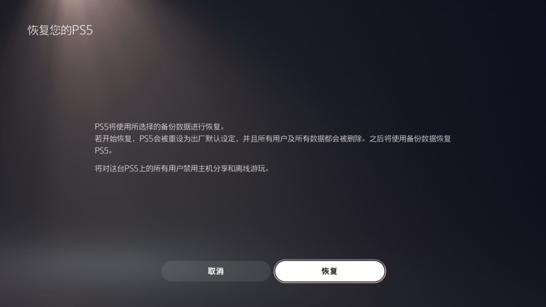 ※復原PS5會格式化主機請做好存檔、截圖等內容的保存工作,並且機器上的常用賬戶將被解除登錄