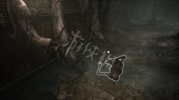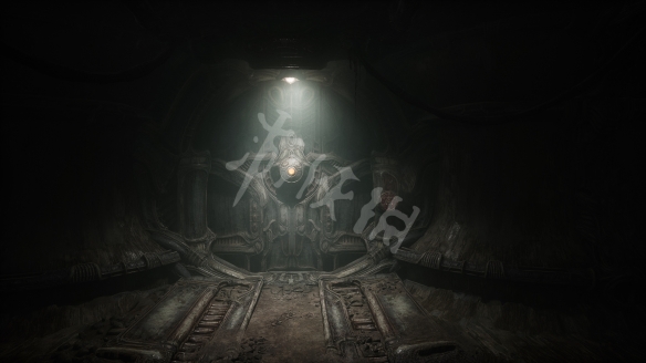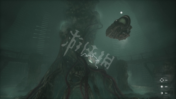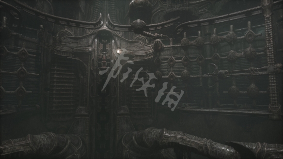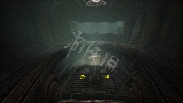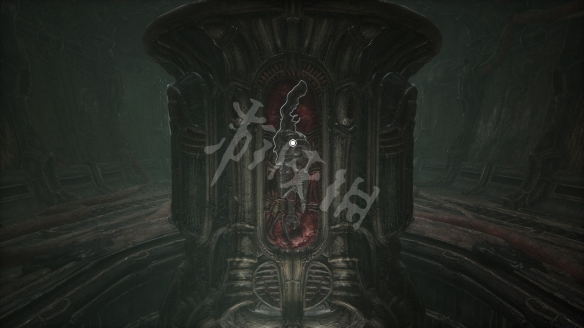 站上平台操作控制台前往上層,來到一個中間有巨大心髒的環形平台,繞行半圈來到一個類似於指揮台的位置,會看到被燈光照射的裝置,踩下踏板升起柱子,取走上面的氣錘槍。