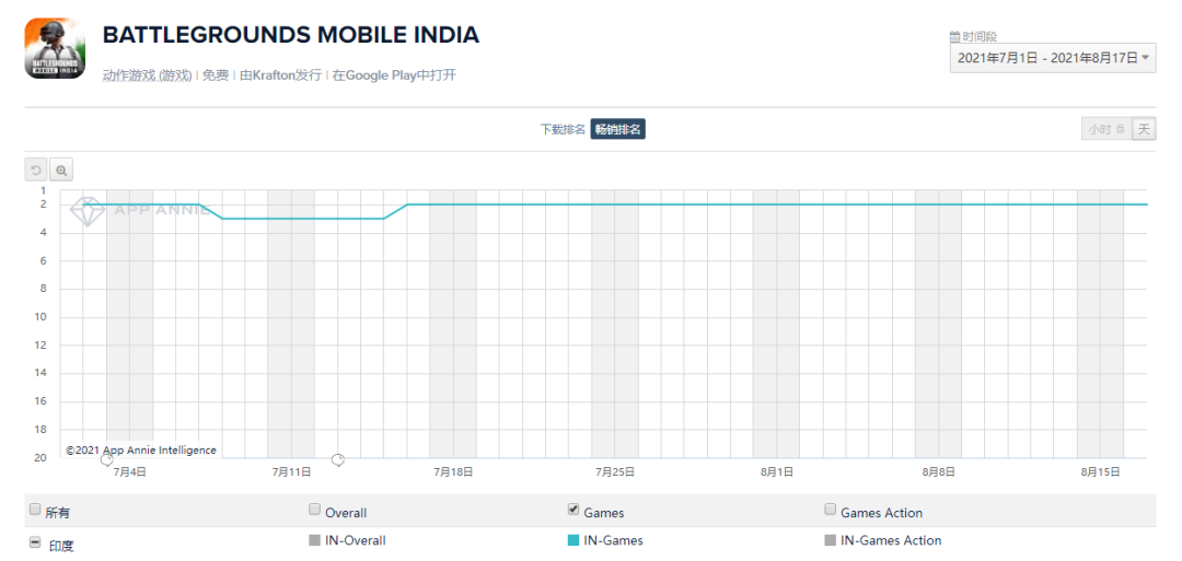 7月份《PUBG Mobile》更名為《Battlegrounds Mobile India》後重新登陸印度市場Google Play,使遊戲在本期內下載量大增,飆升到2240萬次,不過發行單位也更改為Krafton。