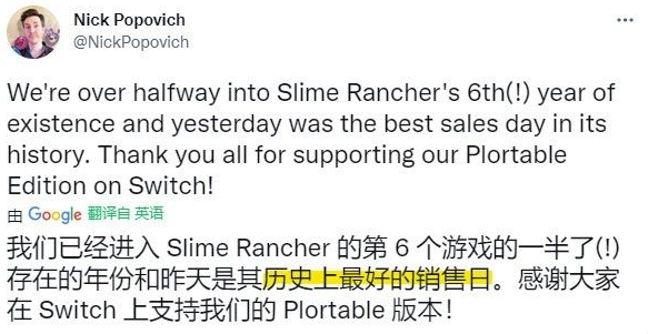 近日,《史萊姆牧場》游戲開發商 Monomi Park 聯合創始人、CEO Nick Popovich發布信息表示,在幾乎毫無提前宣傳的情況下,Switch平台的《史萊姆牧場》首發當日即打破了銷售記錄,成為這款游戲歷史上銷量最高的一天。目前, Monomi Park 正在開發《史萊姆牧場2》並預計於2022年發售,或許也將會登陸Switch平台。