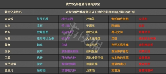 紫竹化身的好感可以通過贈送禮物來提高,他們最喜愛西域珍寶,贈送禮物時能獲得10倍好感。