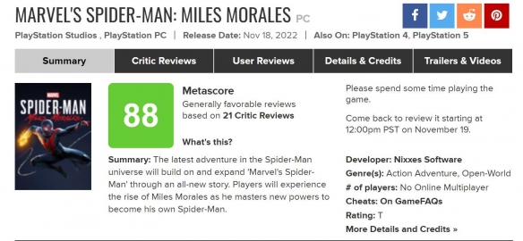 蜘蛛俠邁爾斯莫拉萊斯現已正式登陸pc端,目前M站評分為88分,21家評分媒體全部好評。
