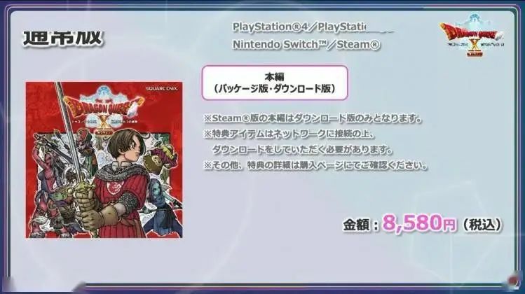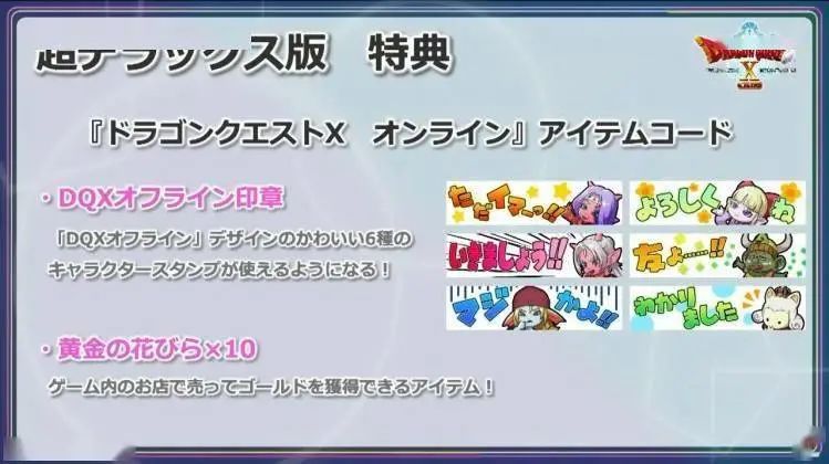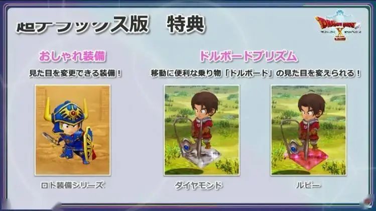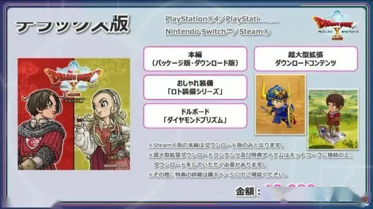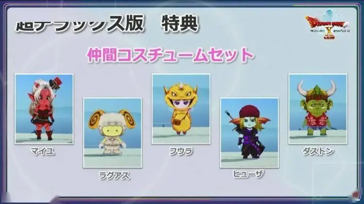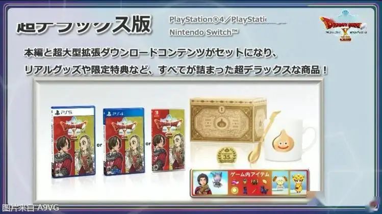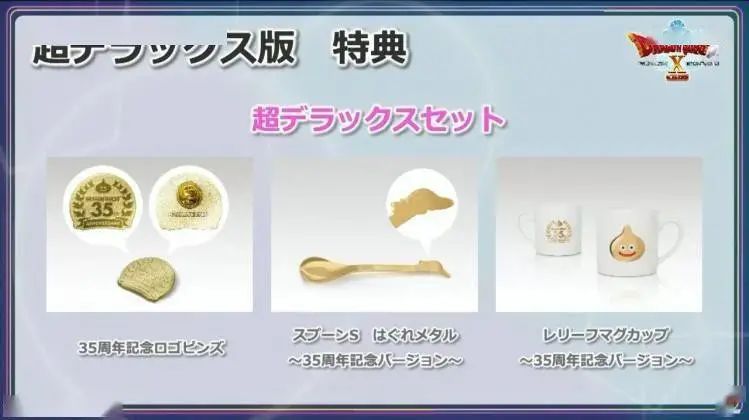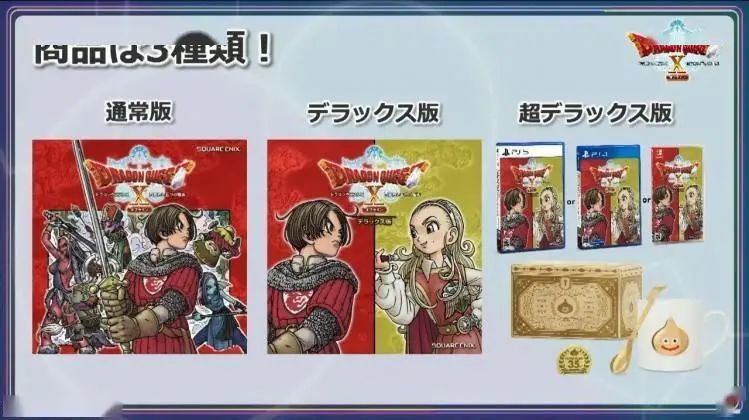 官方在節目最後公開了《勇者斗惡龍X 覺醒的五個種族 離線版》PS5/PS4/Switch版實體包裝、版本信息、價格、特典道具、超豪華版收錄內容等情報。超豪華版將包含遊戲本體、特別外包裝盒、DQ35周年馬克杯、湯匙、胸針、隊友NPC外觀服裝、道具包代碼、外觀時裝、坐騎等。
