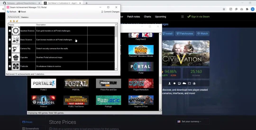 以遊戲《傳送門》為例,如果你想解鎖其成就,可以在SAM上進入其頁面,然後就能看到完整的成就列表。最前方打勾的代表你已經解鎖的成就,沒有打勾的代表尚未解鎖。