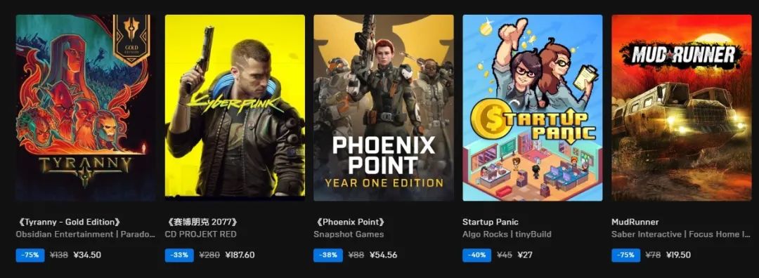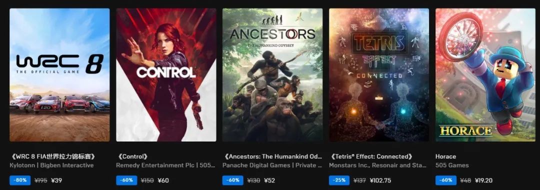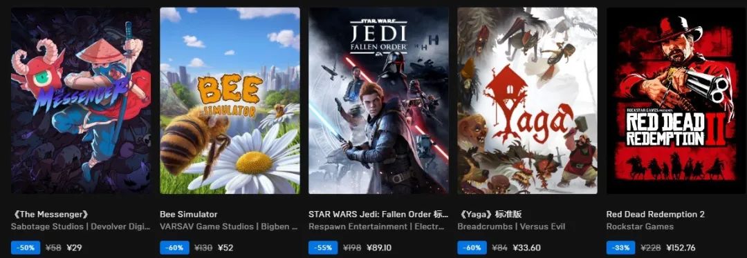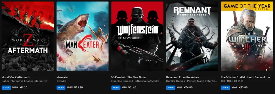 《巫師3:年度版》特價33.8元,《賽博朋克2077》特價187.6元,《死亡擱淺》特價119.6元,殭屍世界大戰:劫後餘生》特價111.2元,《殺手3》特價101元、《騎士精神2》特價109.6元、《荒野大鏢客2》特價152.76元、《控制》特價60元、《星球大戰絕地:隕落的武士團》特價89.1元。