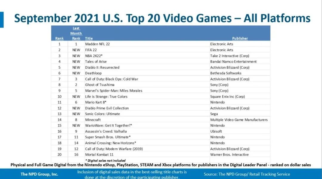 軟體方面,EA Sports遊戲《Madden NFL 22》登頂,入圍的新發售遊戲有《FIFA 22》《NBA 2K 22》,《破曉傳說》、《暗黑破壞神2:重製版》《死亡循環》等。
