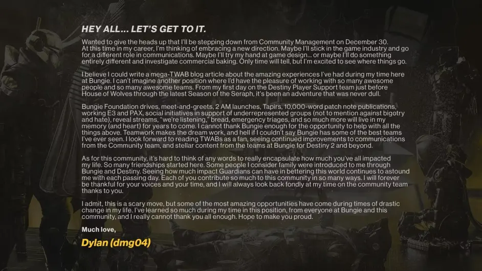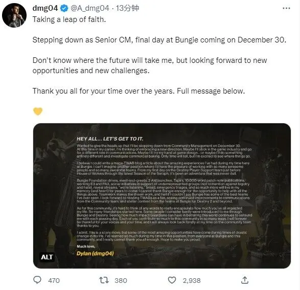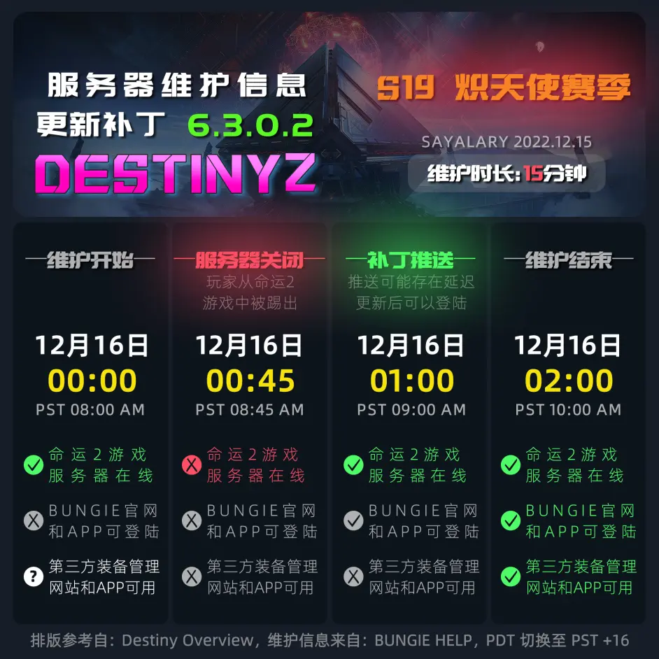 首頁 命運2 百科 《命運2》停機維護 6.3.0.2 2022-12-16 2022.12.16 零點命運2 伺服器 開始 維護 調整方向命運2 商人物品模組和PERK職業天賦相關 另外,年底 DMG04 將會離職希望DMG04能找到更好的工作