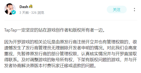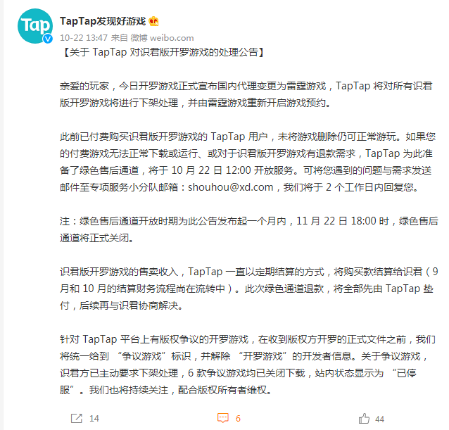 TapTap也發布公告,宣布下架所有識君版開羅遊戲,開啟綠色退款通道,並由雷霆遊戲重新開啟遊戲預約。