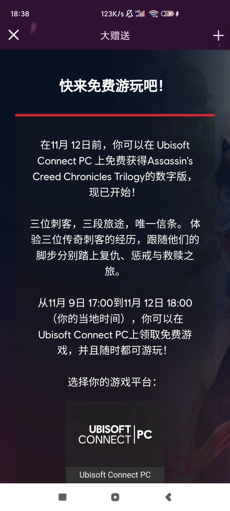 11月9日至11月12日期間,在「大贈送」活動頁面育碧賬戶,選擇唯一選項”Ubisoft Connect PC”為遊戲平台,即可免費領取遊戲入庫