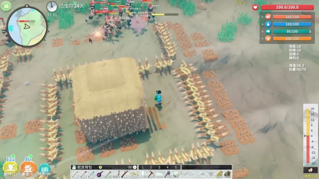 遊戲中你不僅需要維持好飽食、水分、精神等狀態,還需應付體溫、負重、風雨、中毒、野獸、敵人等情況。好在所有問題都有若干方法來應對,採集各種材料,製造對應工具,從零開始打造屬於自己的小康未來!