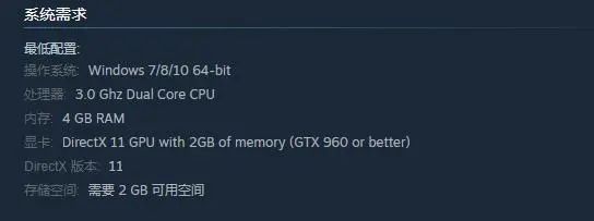 顯卡: DirectX 11 GPU with 2GB of memory (GTX 960 or better)