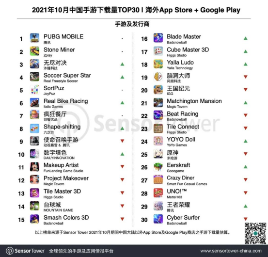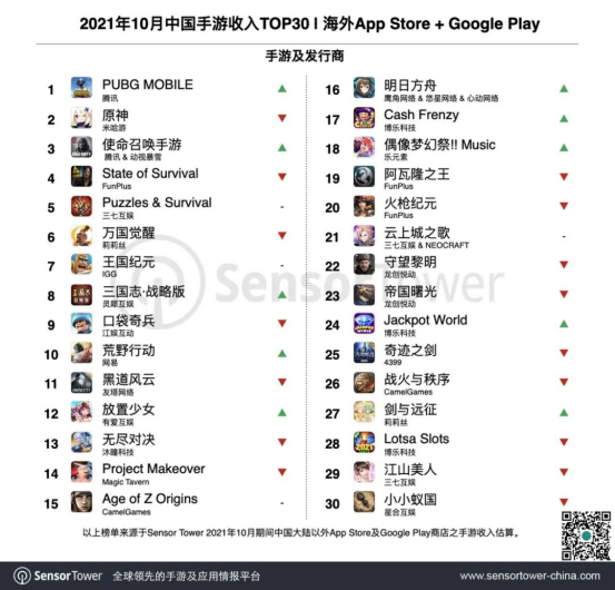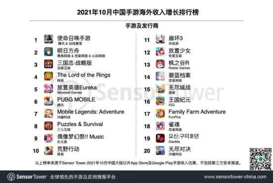 近日,Sensor Tower商店情報平台公布了2021年10月中國手游產品在海外市場收入及下載量排行榜單。
