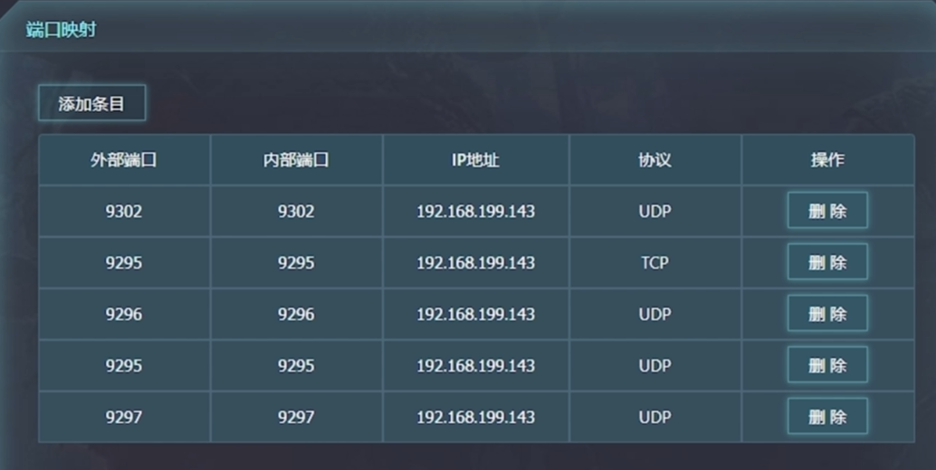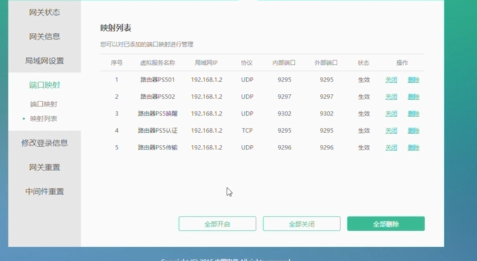 在電信後台埠映射那裡,區域網iP添加輸入路由器的IP,然後按照PS4或PS5主機來添加5個映射。