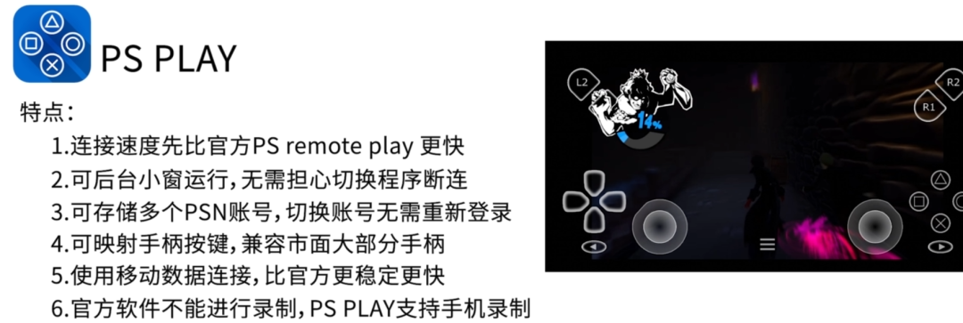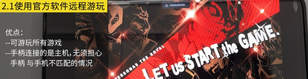 2.1方法優點是手柄無延遲,這種方法因為不能離PS主機過遠,所以使用時基本都是手機和主機在同一網路下,相當於區域網串流,延遲低,操作上不會因為網路或者手機原因,出現卡頓情況等現象,所有類型游戲都可以遊玩。