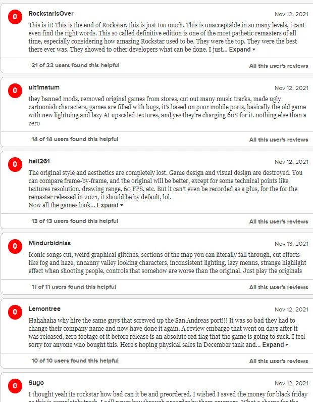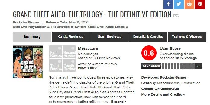 《GTA:三部曲-終極版》自首發以來就負面消息頻發,不出所料的是,這款游戲在Metacritic上遭遇了差評轟炸。PS5版游戲用戶評分只有1.1分。PC版就更差勁了,只有0.6分。