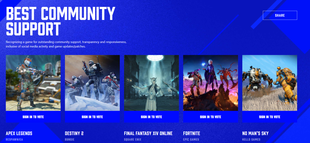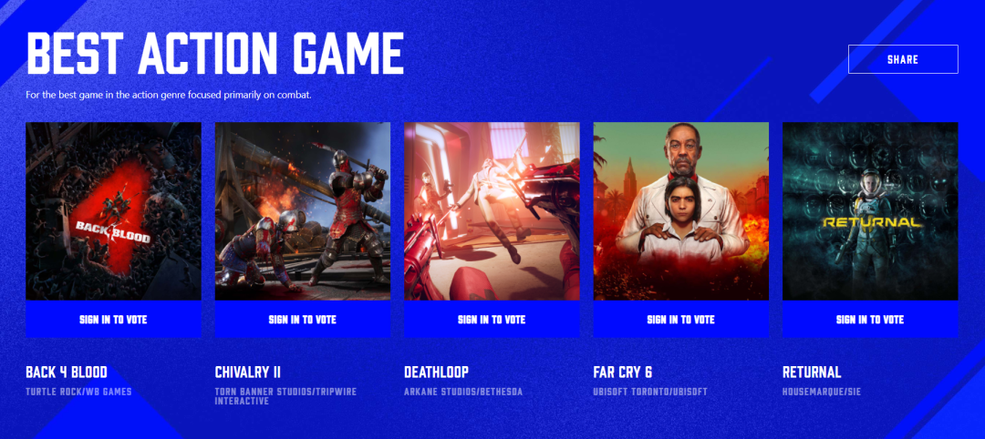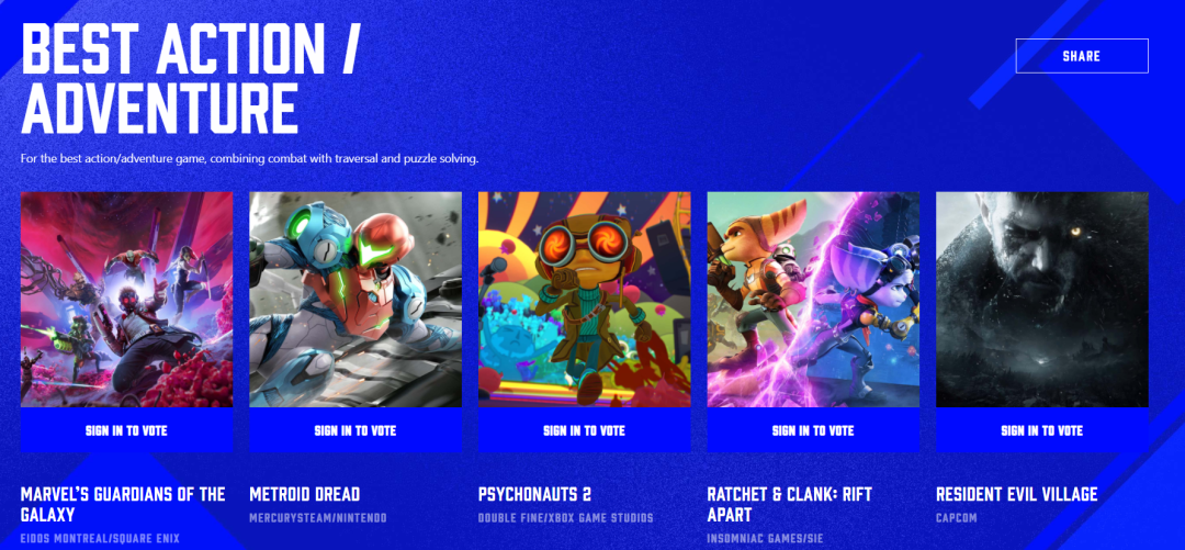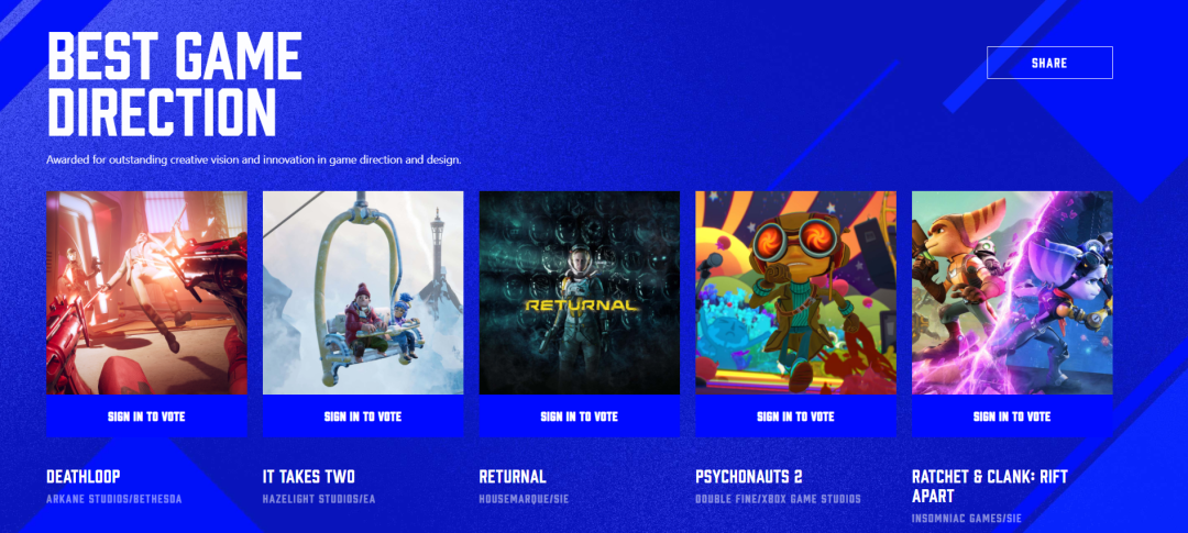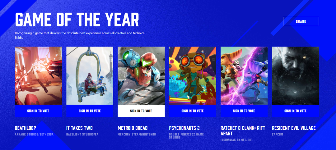 在所有提名游戲當中,《死亡循環》獲得包括「年度游戲」「最佳游戲敘事」「最佳藝術指導」等9項提名,《瑞奇與叮噹 時空跳轉》獲得6項居於次序,《雙人成行》與《腦航員2》分別各獲得5項提名,現在主辦方已開放玩家投票入口,現可前往Bilibili平台的TGA 2021專題頁或者TGA官網為心儀的游戲投票。