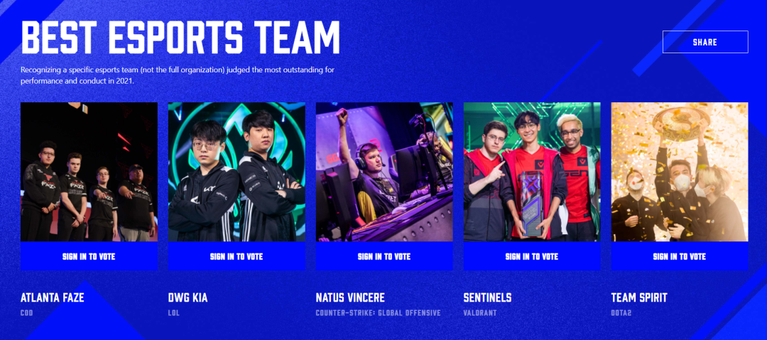 Atlanta FaZe (使命召喚) DWG KIA (英雄聯盟) Natus Vincere (反恐精英:全球攻勢) Sentinels (無畏契約) Team Spirit (DOTA 2)