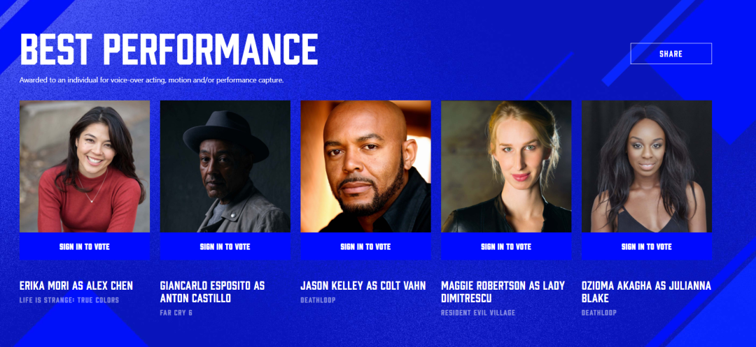 Erika Mori(奇異人生:真實色彩) Giancarlo Esposito(孤島驚魂6) Jason E. Kelley(死亡循環) Maggie Robertson(生化危機8:村莊) Ozioama Akagha(死亡循環)