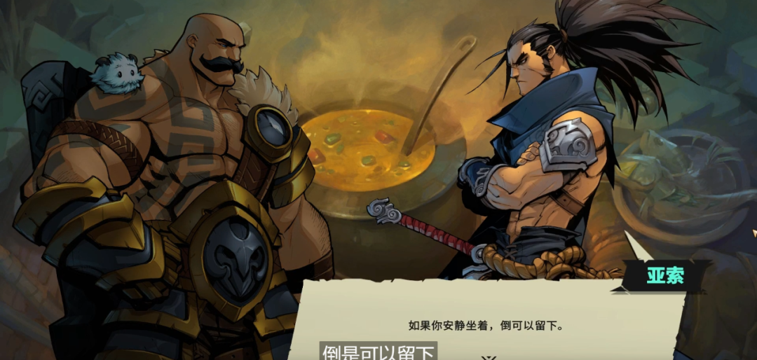 比如說,當玩家在篝火休息時,隊伍里的英雄之間都會發生各種對話。熱情好客的「布隆」會主動挑起話題,向大家介紹著故鄉「弗雷爾卓德」的風土人情,時不時伴隨幾聲爽朗的笑聲。而「亞索」則會在一旁沉默地吃著東西。當「布隆」過來找他聊天時,他先是冷冷地拒絕,但最後又默認布隆可以坐在他身旁,生動形象地刻畫出了亞索外表冷酷,內心孤獨的性格特點。