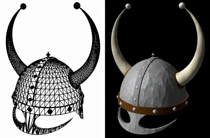 為了方便渲染,遊戲中的物體很喜歡用「三角形」來製作,比如下圖左中的維京頭盔使用了數千個三角形,下圖右是渲染後的樣子。使用三角形的原因是它們的形狀相對簡單,因此開發者無需為遊戲中每個物體編寫單獨的程序。