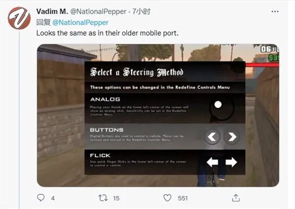 國外玩家 Vadim M.在推特上發文,給出了《GTA:三部曲》客戶端中手機版模擬按鍵控制項的截圖,並說道:「哈哈,這再次證明了我們正在體驗經過高度修改的手機移植版本。代碼中仍然有這個小部件,它要求玩家選擇觸摸控制。 」