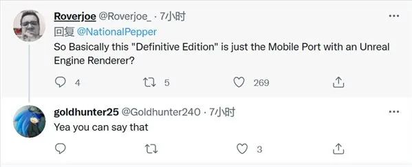 帖子下方有玩家看後問道:「所以基本上這個『最終版』只是帶有虛幻引擎渲染器的手機版? 」對於這條評論,有很多玩家贊同,認為事實就是如此。
