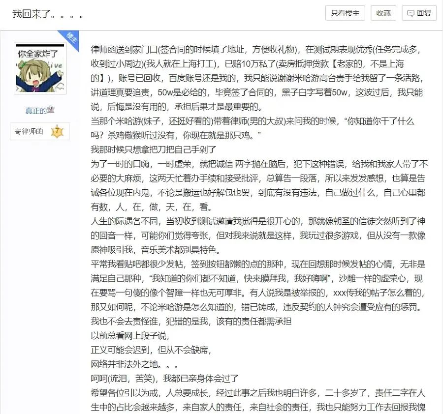 而今年6月份,一名「內鬼」便在貼吧現身說法,表示親身體驗過網路並非法外之地,希望其他人引以為戒。根據他的描述,違反保密協議協定需要賠償50萬,好在米哈游「高抬貴手留我一條活路」,最終「已賠10萬私了」。