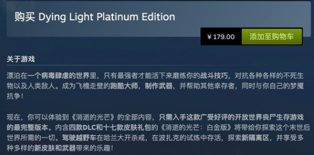 1.03版本更新重點內容如下:修正了中文語言導致遊戲崩潰的問題修復複製bug提升在線合作穩定性UI和翻譯修正普通錯誤修正追加成就系統《消逝的光芒》是一款喪屍題材的第一人稱動作生存遊戲,而《消逝的光芒白金版》不但收錄了遊戲本體,還包含了遊戲的四款DLC和十七款皮膚禮包,本作目前在Steam商城售價179元。