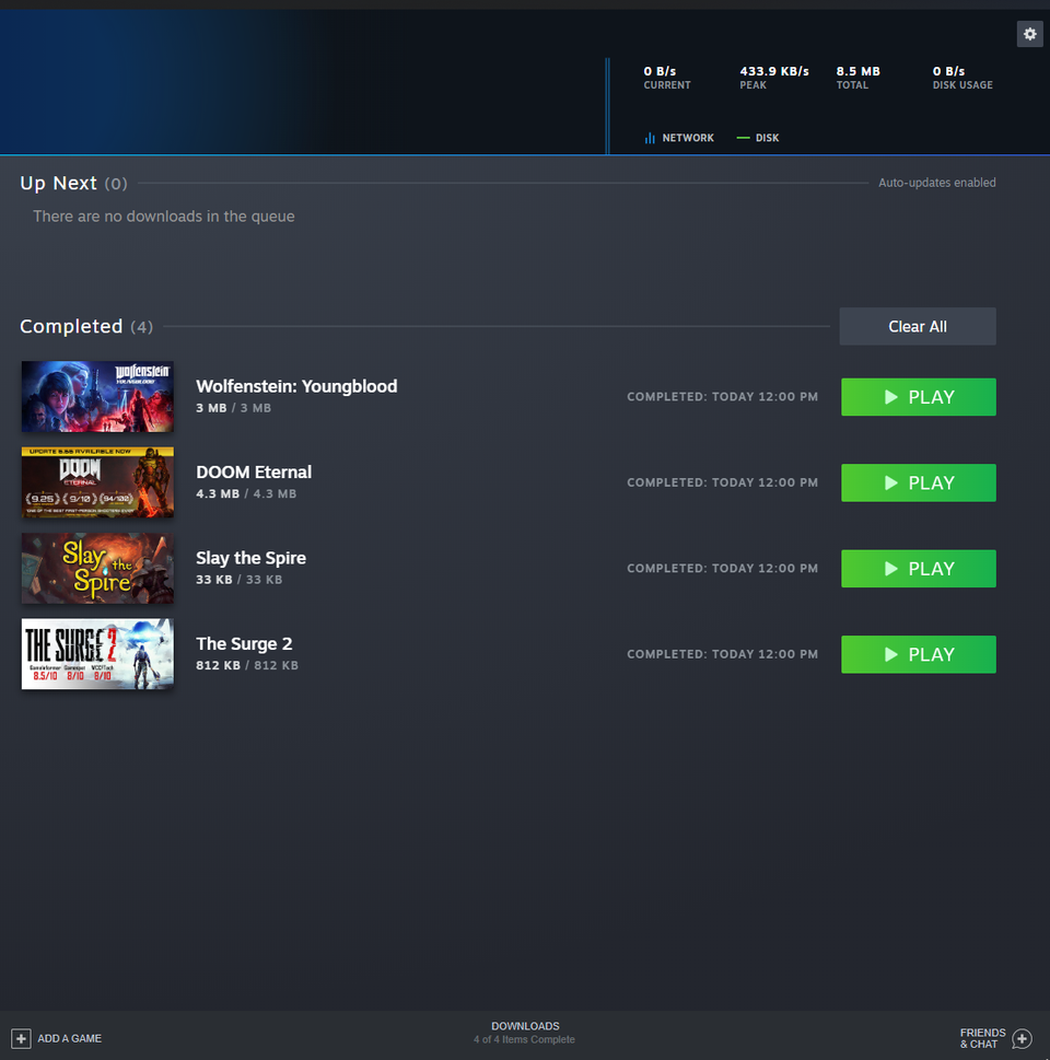 從下圖就可以發現,有4款遊戲在更新,分別是《德軍總部:新血脈》、《毀滅戰士 永恆》、《殺戮尖塔》和《迸發2》,每個更新文件都很小,最大的不超過5MB,最小的只有33KB。