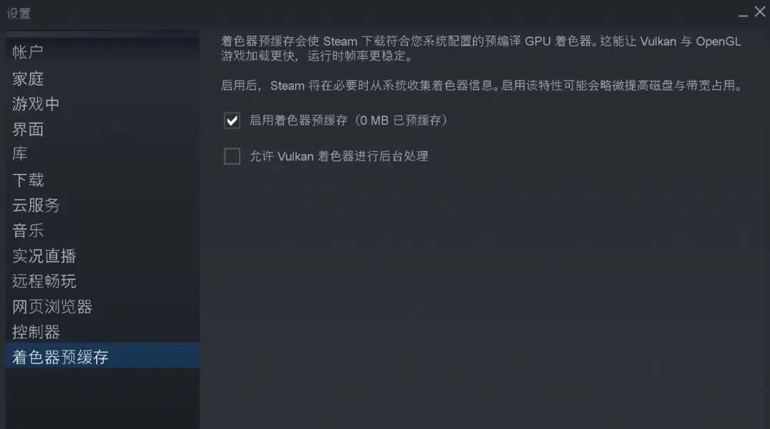 當然,著色器預緩存會佔用一些帶寬和硬碟,你可以手動關閉它們,方法是進入設置,切換到選項卡列表底部的著色器預緩存,然後取消選中「啟用著色器預緩存」復選框,如下圖所示: