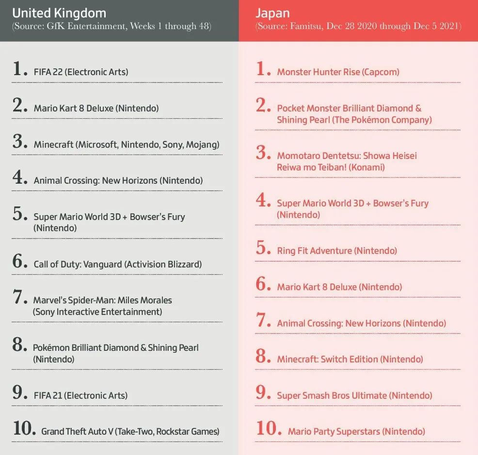 此外GamesIndustry英國、日本2021年度遊戲銷量TOP10,《FIFA 22》拿下2021年英國遊戲銷量冠軍,《怪物獵人:崛起》拿下2021年日本遊戲銷量冠軍。