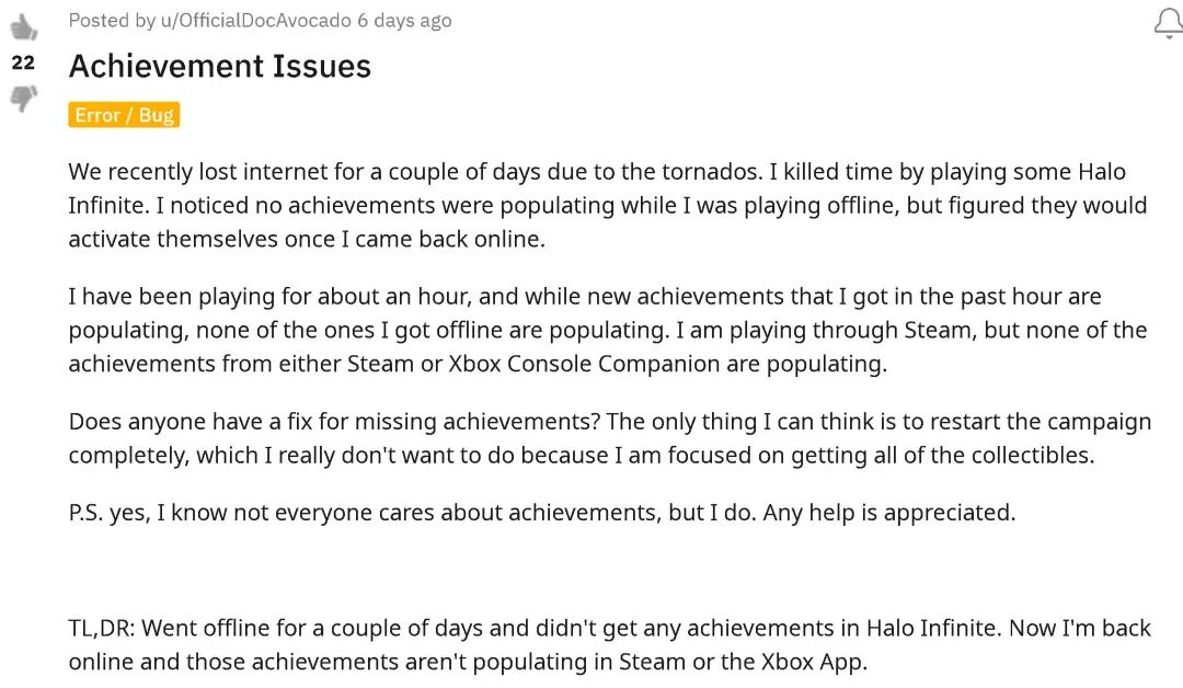 前不久,國外某網友在社交媒體上寫道:「由於龍捲風,我家斷網了幾天,我通過玩《光環無限》打發時間。但當我重新上線後,離線時的那些成就並沒有出現。有沒有人修復丟失的成就?我唯一想到的就是重玩任務,我真的不想這樣做,但我想獲得所有的收藏品。」