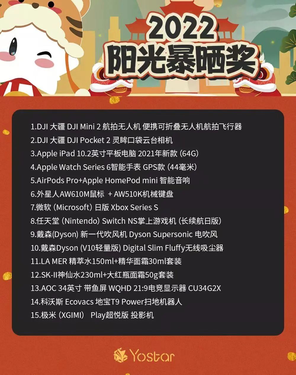 與之類似的還有同為出海大佬的悠星,同樣也升級為了「陽光暴曬」,獎品內容也十分豐厚,比如大疆的熱門無人機、相機、戴森的熱銷商品、XSS、NS等。
