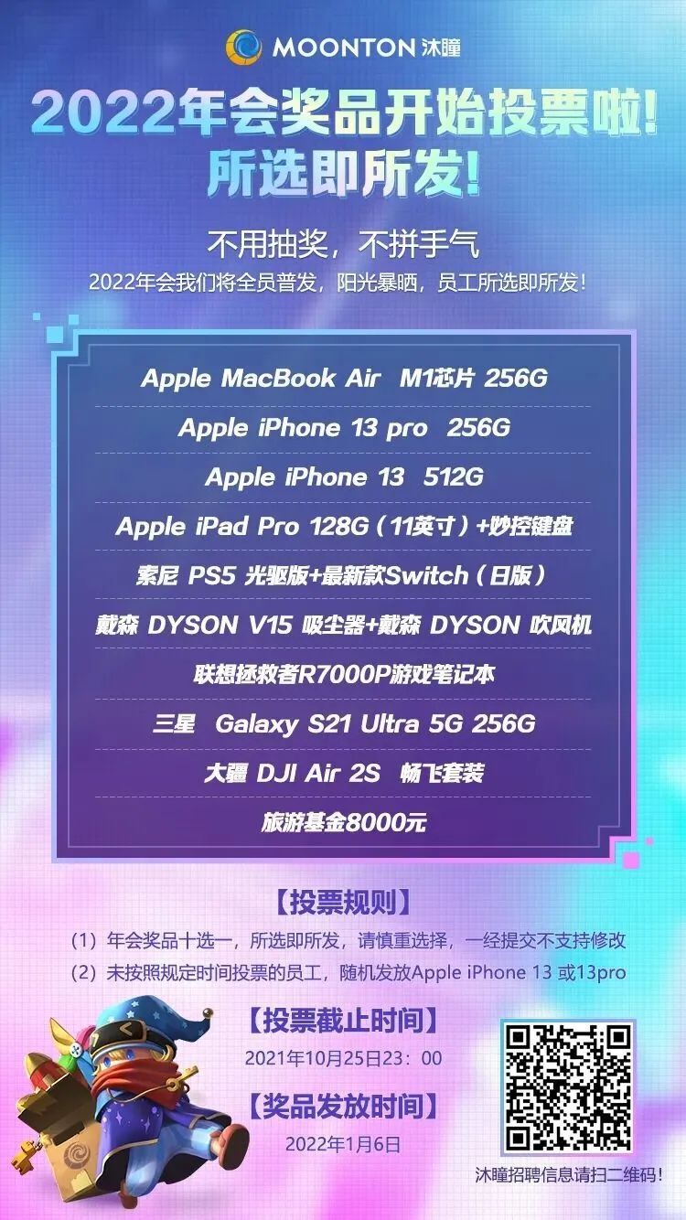 因此沐瞳在年會獎品上出手十分闊綽,已經不滿足於陽光普照的力度,並將之升級為「陽光暴曬」,不用抽獎、不拼手氣,全體員工均能在眾多獎品中投其所好,選擇最適合自己的獎品。