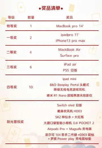 擁有「上海四小龍」之稱的新銳游戲公司鷹角在獎品力度堪稱代表,豪氣設置了一套蘋果最新的「全家桶」為特等獎,而在一等獎、二等獎甚至陽光普照獎品層面中也不乏一些熱門的數碼產品比如3080Ti顯卡、PS5、Apple Watch、神仙水等。