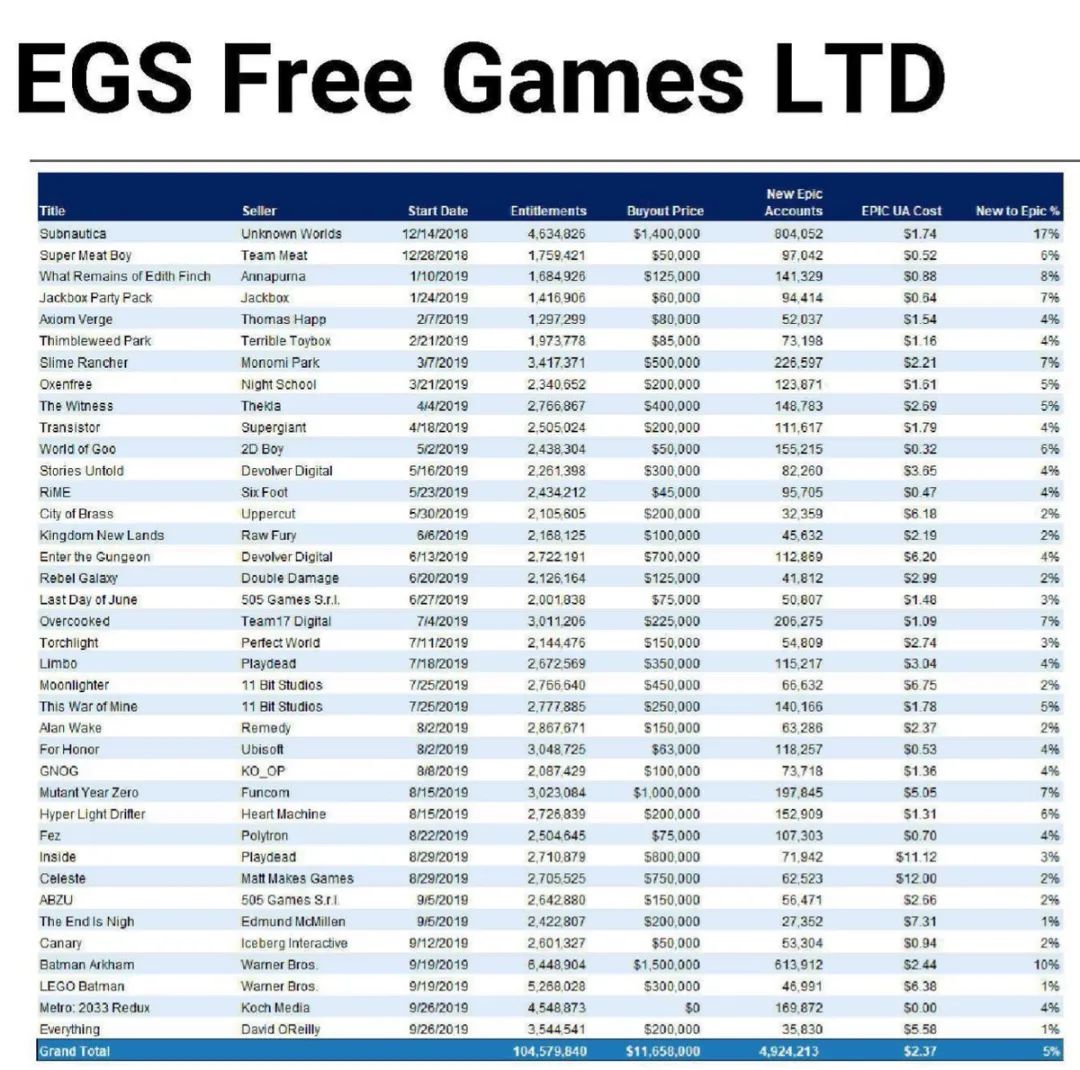 下圖是Epic商店在2019年送的游戲,以及各自游戲對應的費用。可以發現,Epic商店為這些游戲花了1165萬美元,帶來492萬新用戶。
