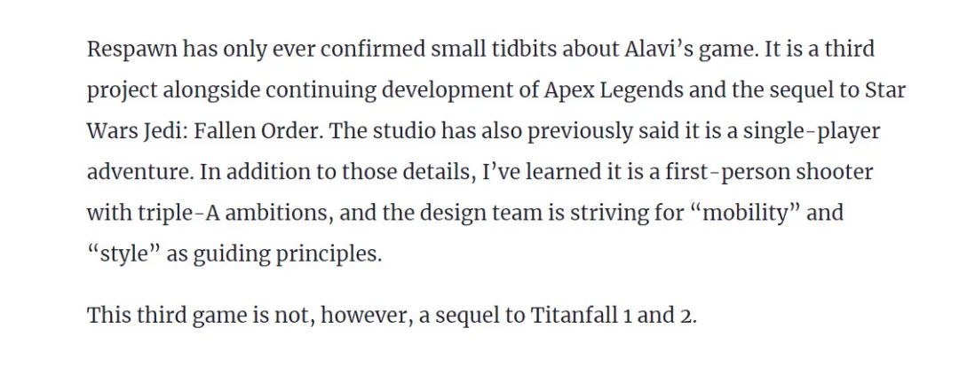 最近重生娛樂的資深開發者Mohammad Alavi離開,據GamesBeat報道,他當時在重生娛樂擔任一個未公布新作的總監。據報道,這個新作將是一個3A級FPS遊戲,但不會是《泰坦隕落3》。雖然如此,但該作會和《泰坦隕落》會有相似的地方,因為開發團隊強調「風格化」和「移動性/機動性」。