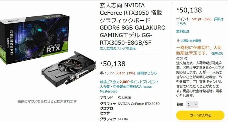 日本市場上已經開始有玄人志向品牌的RTX 3050顯卡預售,價格是50138日元,約合人民幣2789元,相比國行價格溢價將近50%。