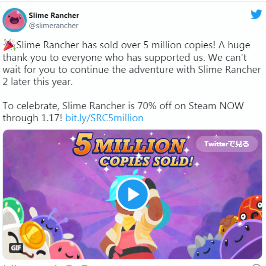 為紀念本作銷量突破500萬份,本作的遊戲本篇和DLC現已在Steam開啟特價促銷,截止1月18日前購買本作遊戲本篇可以享受到70%的折扣,購買DLC可以享受到30%的折扣。本作的續作《史萊姆牧場2》此前也已發表,預計將於2022下半年在PC(Steam/Epic)/Xbox Series X|S平台發售,敬請期待。