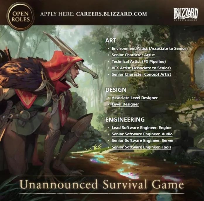 暴雪官方公開信息: 暴雪正在展開新的探索旅程。我們即將前往一個全新的宇宙,迎來一款嶄新的PC和主機端生存遊戲。在那裡,我們將遇見未曾謀面的英雄,聆聽未曾講述的故事,並經歷未曾體驗的冒險。一片充滿無限可能的廣闊天地正在等待著我們去探尋。 每個故事都需要講述者,正如每個世界都需要構築者。也許,你正是那個合適的人選? 三十年以來,暴雪為全球千百萬名玩家創造了各式繽紛的遊戲宇宙。這需要一個多元化的開發團隊,踴躍發聲,甘願傾聽,才盡其用,集思廣益。這是我們的使命。 你是生存類遊戲的愛好者嗎?你是否願意加入一個全新項目,在立項初期就與一個經驗豐富的開發團隊並肩努力,共同書寫暴雪故事的新篇章? 一場華麗的冒險正在召喚。而你,是否願意加入?