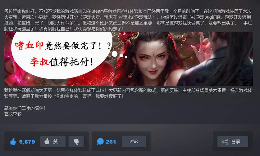 很難想像正式版的《嗜血印》,僅僅依靠三人團隊就做到了如此的地步,這其中毅力與能力,缺一不可。游戲製作人李馳程在正式版上線前夕,就曾發短文慶祝過此次的大型更新。顯然,《嗜血印》如今的成功,是誰都難以想到的,包括他自己。