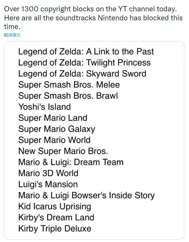 油管博主GilvaSunner主要靠上傳任天堂遊戲原聲帶吸引粉絲,截止到目前他的頻道已經有接近50萬人訂閱。近日他在Twitter上說過去幾天內任天堂下架了他超過1300個視頻,這些視頻有諸如《塞爾達傳說:黃昏公主》、《超級馬里奧:銀河》和多個其他遊戲的原聲帶。