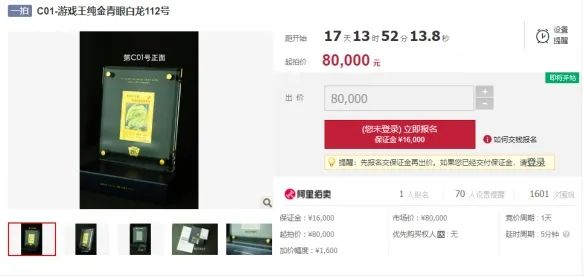 據阿里拍賣網頁顯示,這張編號為112號的純金青眼白龍卡將於3月12日早上9點開啟拍賣。而與去年那張起拍價80元,最終拍出8700萬元的青眼白龍不同的是,處置方任縣人民法院將這次的起拍價格設置為8萬元,而參與拍賣首先需要繳納16000元人民幣,每次加價至少1600元!