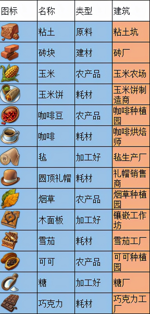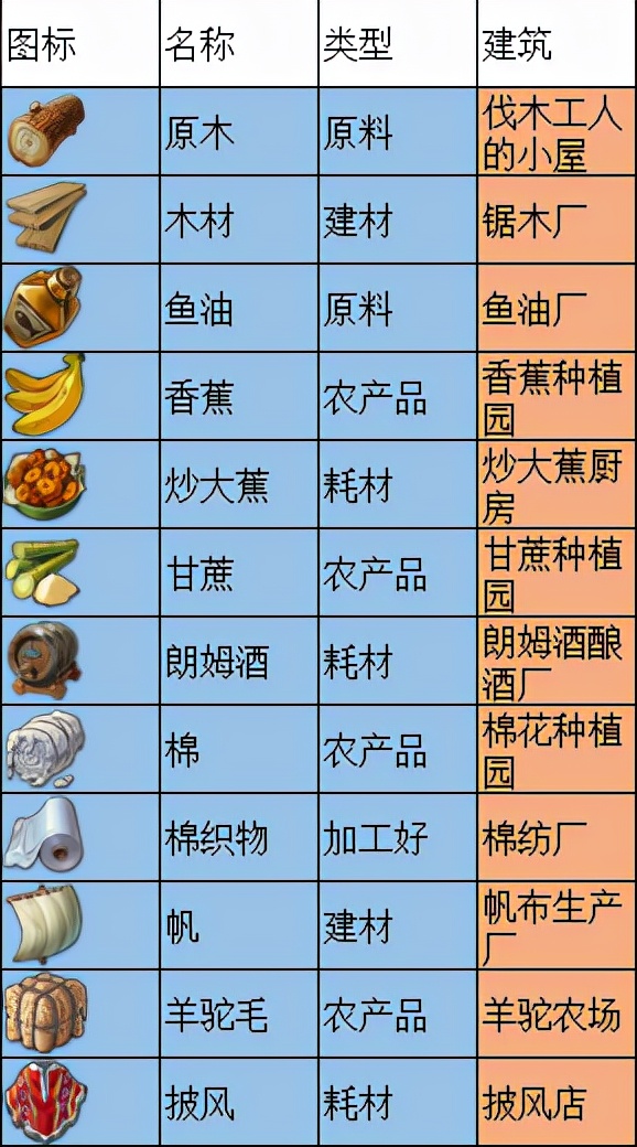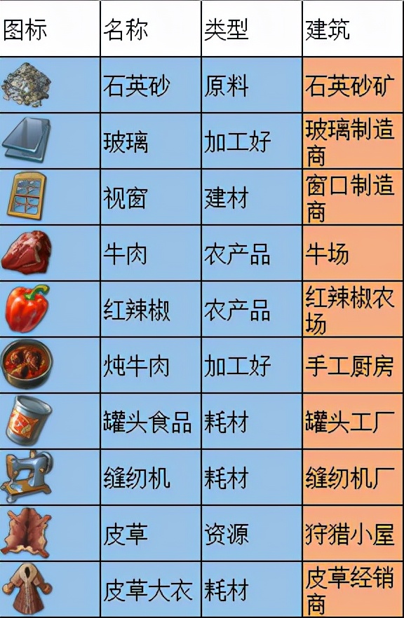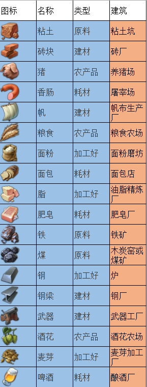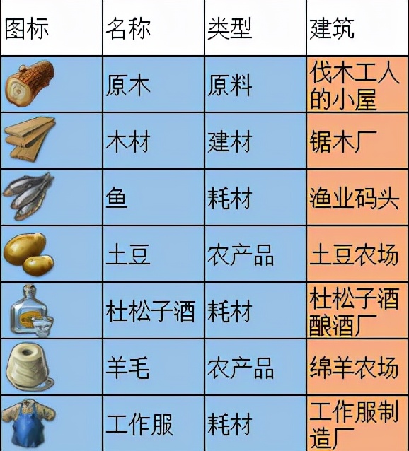 物資主要用於滿足人的需求,或者成為生產鏈中的重要原料。它們的獲取上面第一部分有提到過,不再贅述。下面,鯊魚哥做了幾個Excel表格,來給大家總結一下我自己知道的相應的人群所需要用到的物資。因為個人遊玩時間的不足,所以絕對有資源的缺漏,希望各位大佬指正。