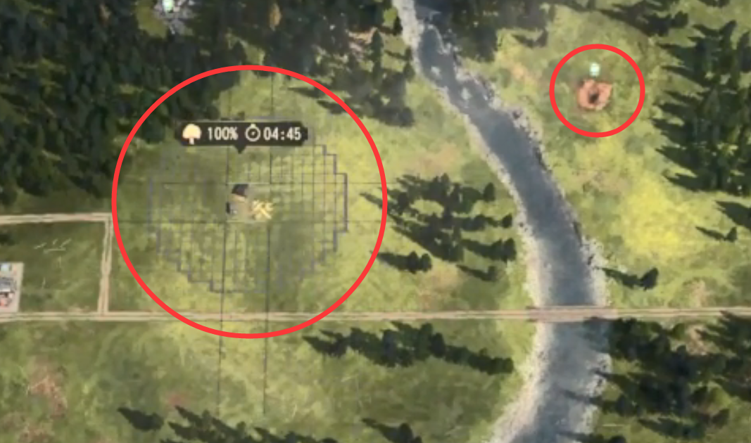 左側是伐木場,可以看到100%的效率提示,右側則是開採黏土前必須找到的黏土坑