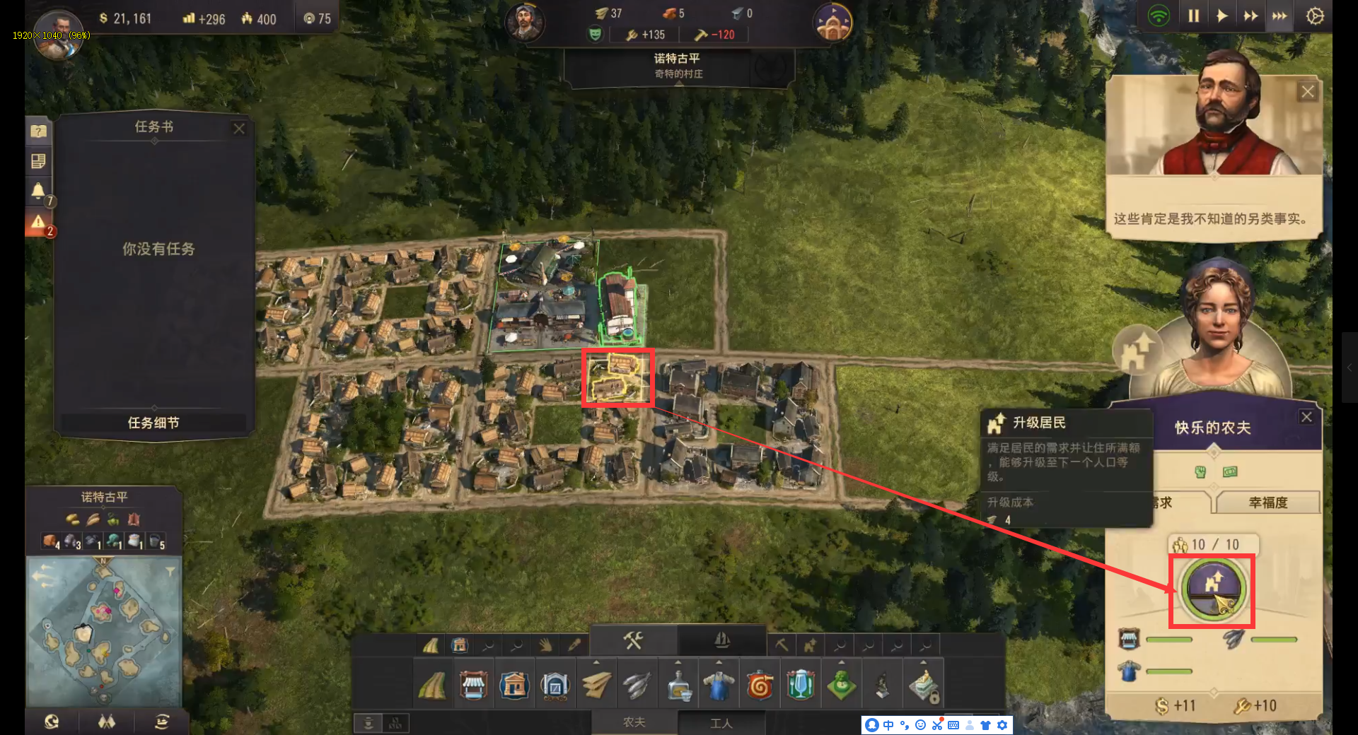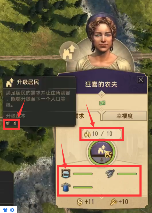 例如上圖:農夫住宅升級到工人住宅需要10個人口住滿、需要滿足其市集、魚肉、工作服的三個基本需求、需要四個木材建材。