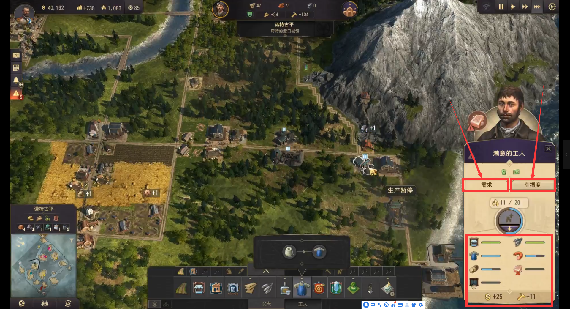 滿足基本需求實際上也是整個遊戲中最需要考慮的點之一:基本需求會增加每個房屋裡的居民人數,只有這個房屋的人數滿了才可以升級到更高層次的人口類型。